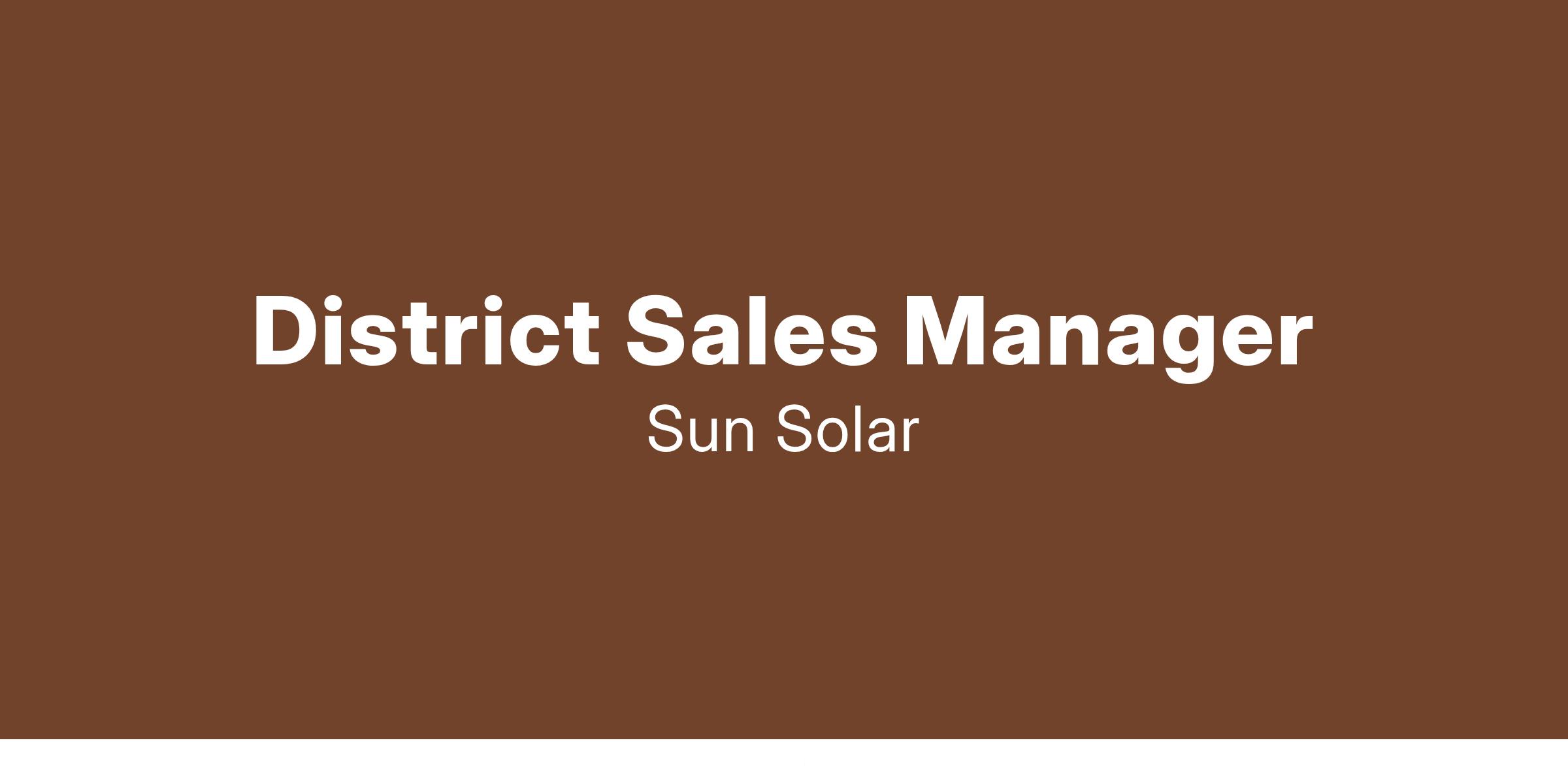 Job Overview: Sun Solar is looking for a dynamic District Sales Manager to join the region's most successful company specializing in the renewables industry. The District Sales Manager reports to the Director of Sales. Sun Solar is an innovative leader in clean energy, striving to create a sustainable planet through alternative energy solutions. Sun Solar is searching for a professional, self-motivated, critical thinker to join our family and help us provide affordable energy.